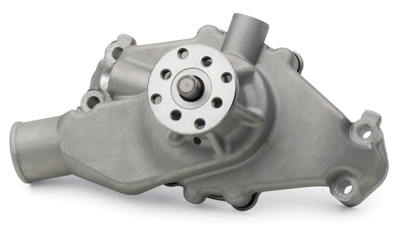 Engine Water Pump; Fits Small Block Chevy Engines; High-Flow Model; Mechanical Type; Short Style Pump; Made from High-Quality Aluminum; Satin Finish; Heavy-Duty Ball Bearings; Sold Each