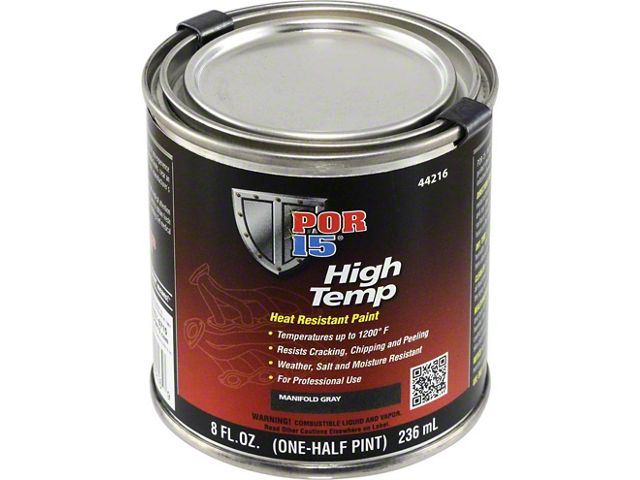 POR-15® Factory Manifold Gray is a high temp gray paint capable of withstanding extreme temperatures up to 1400°F. This high temp paint will maintain a durable cast iron gray color and won't burn off. Can be used on all cars, domestic or foreign, and it meets or exceeds properties and requirements of MIL-C-13370. Can be brushed or sprayed.