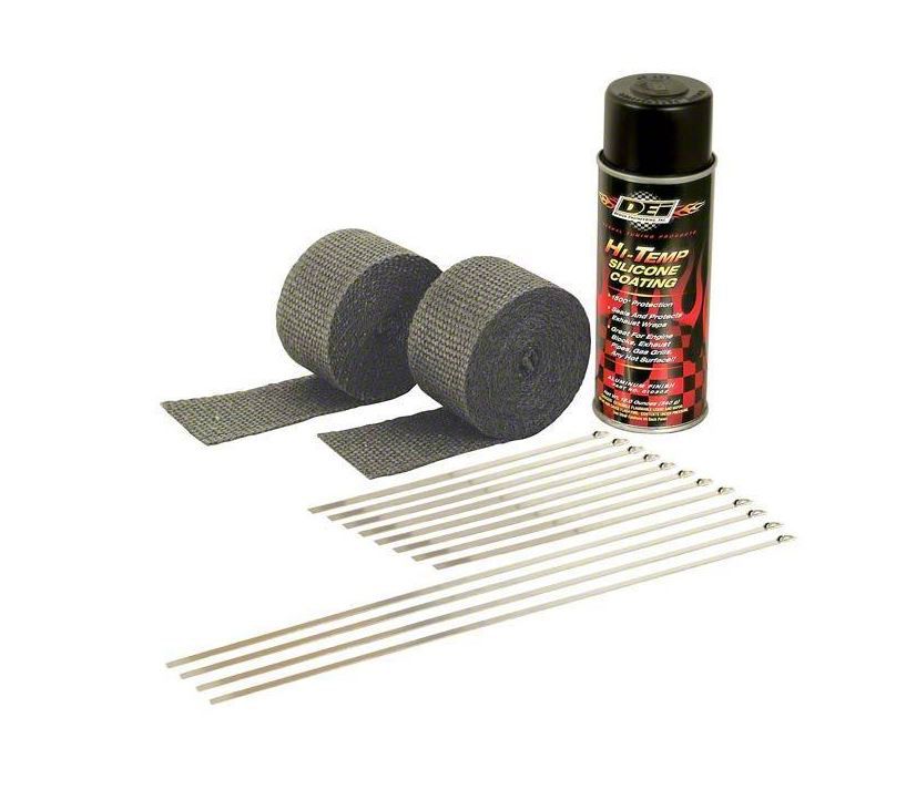 An all-in-one kit for wrapping a set of headers or motorcycle pipes. Automotive kit includes two 2” x 50ft rolls of exhaust wrap one can of HT Silicone Coating & Locking Ties. Included Free Locking Tie Tool. Comes in Retail Clamshell Packaging The header wrap kit is enough for any set of V8 headers. The Header Wrap Kit will wrap from the top of the header where it bolts to the heads all the way down to the collector. Exhaust Wrap Kits save you time an