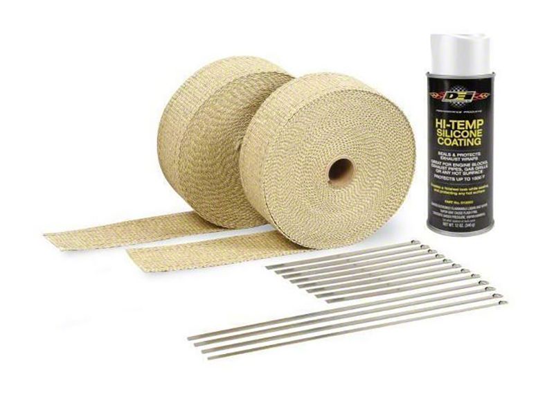 An all-in-one kit for wrapping a set of headers or Motorcycle pipes. Automotive kit includes two 2” x 50ft rolls of exhaust wrap one can of HT Silicone Coating & Locking Ties. Included Free Locking Tie Tool. Comes in Retail Clamshell Packaging The header wrap kit is enough for any set of V8 headers. The Header Wrap Kit will wrap from the top of the header where it bolts to the heads all the way down to the collector. Exhaust Wrap Kits save you time an
