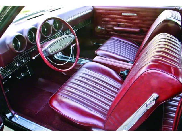 This seat upholstery is a correct reproduction of the original. We offer the original Sierra grain with Kiwi grain inserts in 32 oz. vinyl, with the correct vertical patterns sewn as original. Seat back medallions/emblems are not included. Professional installation is recommended. Be prepared to replace the foam, or at least pad it out. Over time, the original covers typically shrink, which permanently compresses the foam. If new covers are simply installed over used foam a loose, baggy look is usually the result. Sometimes a restorer can get away with using new front covers with an original back seat if the seats are black. Colors vary widely due to the original dye lots, and fading over time. Please consider replacing the re