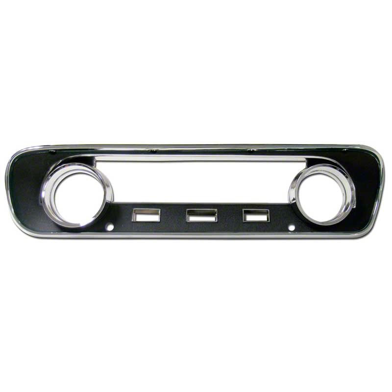 OER® Authorized reproduction of the original 1965 Mustang instrument bezel features correct black camera case color and textured finish with beautiful chrome plated accents. Correct holes, cutouts and contours including amp and oil light openings. Note: Instrument bezel lens is available seperately.