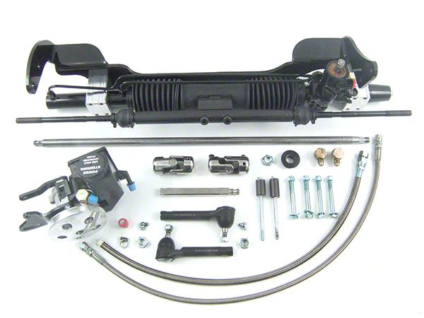 This kit uses a rear steer center take off rack & pinion mounted to a solid one piece bracket which bolts up to the frame using the original holes for the steering box and Idler Arm. This kit works with Small Block Motor cars only. It will fit with the 221, 260, 289, 302, and 351W motors. Installs have been done using Hooker Long Tube Headers or Competition Headers. Other headers may work, but may require modification.