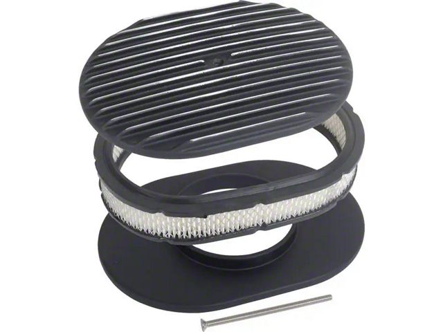 Dress up your classic Ford's engine with this beautiful retro-style finned aluminum 12 inch oval air cleaner from MAC's! It features a black powder-coated, fully-finned top with exposed fin edges for a clean, custom look. This air cleaner will fit most stock and aftermarket carburetors with a 5-1/8" diameter neck like most Carter, Edelbrock, Holley, Rochester, and Quadrajet four barrel carburetors. It also has a raised aluminum base to position the air cleaner above the carburetor flange. Each air cleaner comes with a stainless bolt for mounting. Count on MAC's for all of your classic Ford needs!