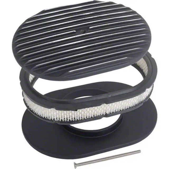 Dress up your classic Ford's engine with this beautiful retro-style finned aluminum 12 inch oval air cleaner from MAC's! It features a black powder-coated, fully-finned top with exposed fin edges for a clean, custom look. This air cleaner will fit most stock and aftermarket carburetors with a 5-1/8" diameter neck like most Carter, Edelbrock, Holley, Rochester, and Quadrajet four barrel carburetors. It also has a raised aluminum base to position the air cleaner above the carburetor flange. Each air cleaner comes with a stainless bolt for mounting. Count on MAC's for all of your classic Ford needs!