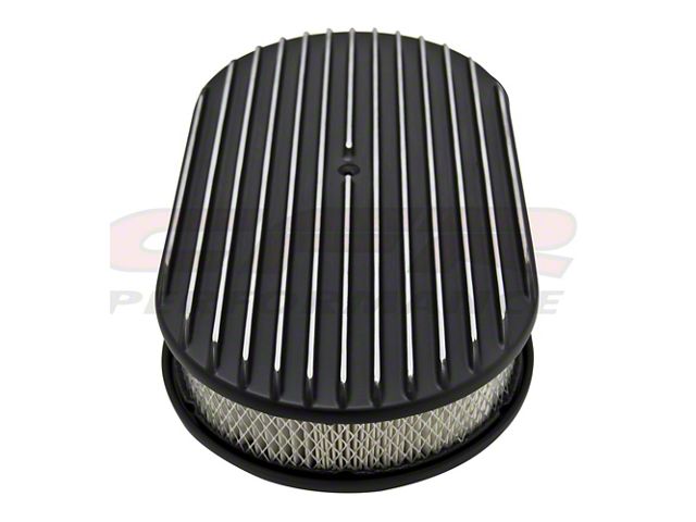 Dress up your classic Ford's engine with this beautiful retro-style finned aluminum 15 inch oval air cleaner from MAC's! It features a black powder-coated, fully-finned top with polished fin edges for a clean, custom look. This air cleaner will fit most stock and aftermarket carburetors with a 5-1/8" diameter neck like most Carter, Edelbrock, Holley, Rochester, and Quadrajet four barrel carburetors. It also has a raised aluminum base to position the air cleaner above the carburetor flange. Each air cleaner comes with a stainless bolt for mounting. Count on MAC's for all of your classic Ford needs.