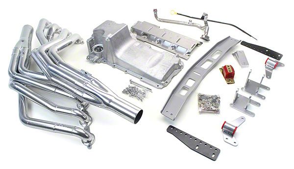 - Includes Ceramic-Coated Headers, a Transmission Crossmember, Engine-Side Mount Adapters, a Transmission Pad, Fit Rite Engine Mount Adapters, and an Oil Pan Kit with Sump Baffle and Oil Pick Up Tube