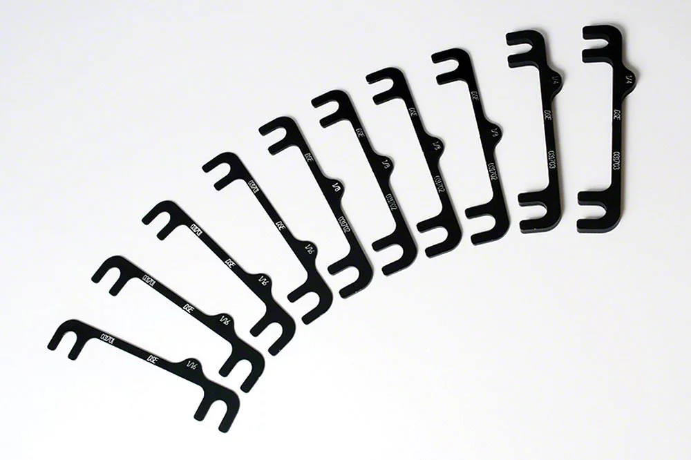 Detroit Speed's Camber Shim Track Kit allows you to adjust camber easily with our one-piece slotted camber shims. Each shim is machined from 6061 aluminum and is then anodized black for durability. The track kit includes four 1/16" shims, four 1/8" shims, and two 1/4" shims to fit your driving needs.