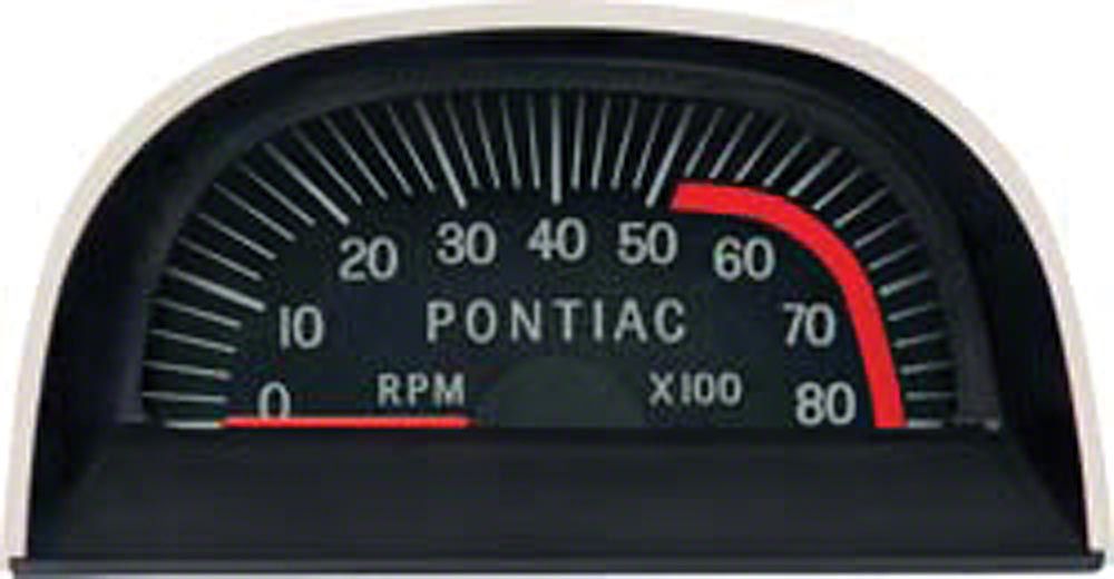This high-quality reproduction tachometer will replace the original exactly and offer years of continuous service. It is manufactured with a tightly sealed case to keep moisture out, which means less corrosion of internal parts and long lasting dependability. Includes 2 bulbs for clearer visibility than the original, plus the correct Pontiac lettering for an authentic look. Officially Licensed by General Motors.