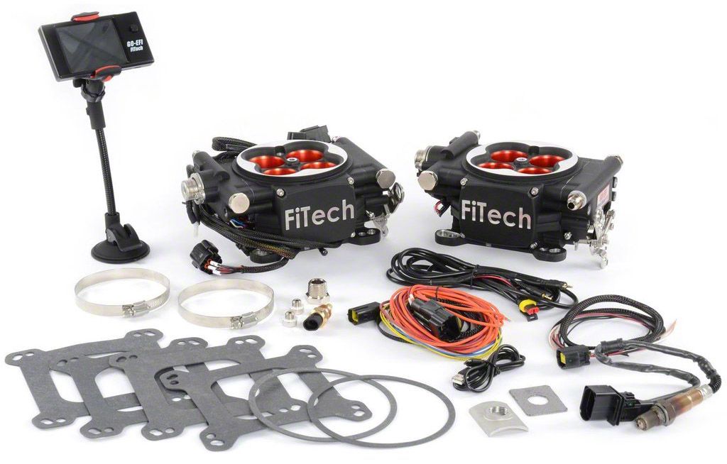Description. The Go EFI 2×4 Power Adder 1200HP Matte Black Self-Tuning Fuel Injection system is rated at 1200hp but is suitable for engines from 400hp thru 1200hp. This Kit is for the guys who have 671 and 871 roots superchargers or make up to 1200hp naturally aspirated on their dual quad setup. FiTech EFI has made it simple with their Go EFI 2×4 Power Adder 1200hp self-tuning system. Works out of the box on your 2×4 blower plate as an inline setup or can be side mounted using custom linkages. Also, this kit is a bolt on for the most popular normally aspirated dual quad and tunnel ram manifolds including the Edelbrock line of dual quad manifolds without any adapters! They fit and look like they belong there because they were designed to fit from the start. One throttle body handles all of the brains while the second holds 4 additional injectors. These can also be used in cross ram and tunnel ram configurations.