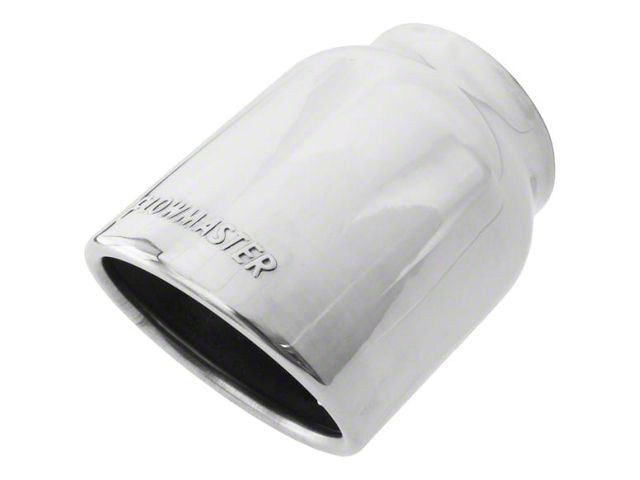 Polished stainless steel tip features weld-on mounting design for custom applications. Slips over 3.00 in. pipe and outer diameter measures 4.00 in. with angled, rolled edge and embossed Flowmaster logo.
