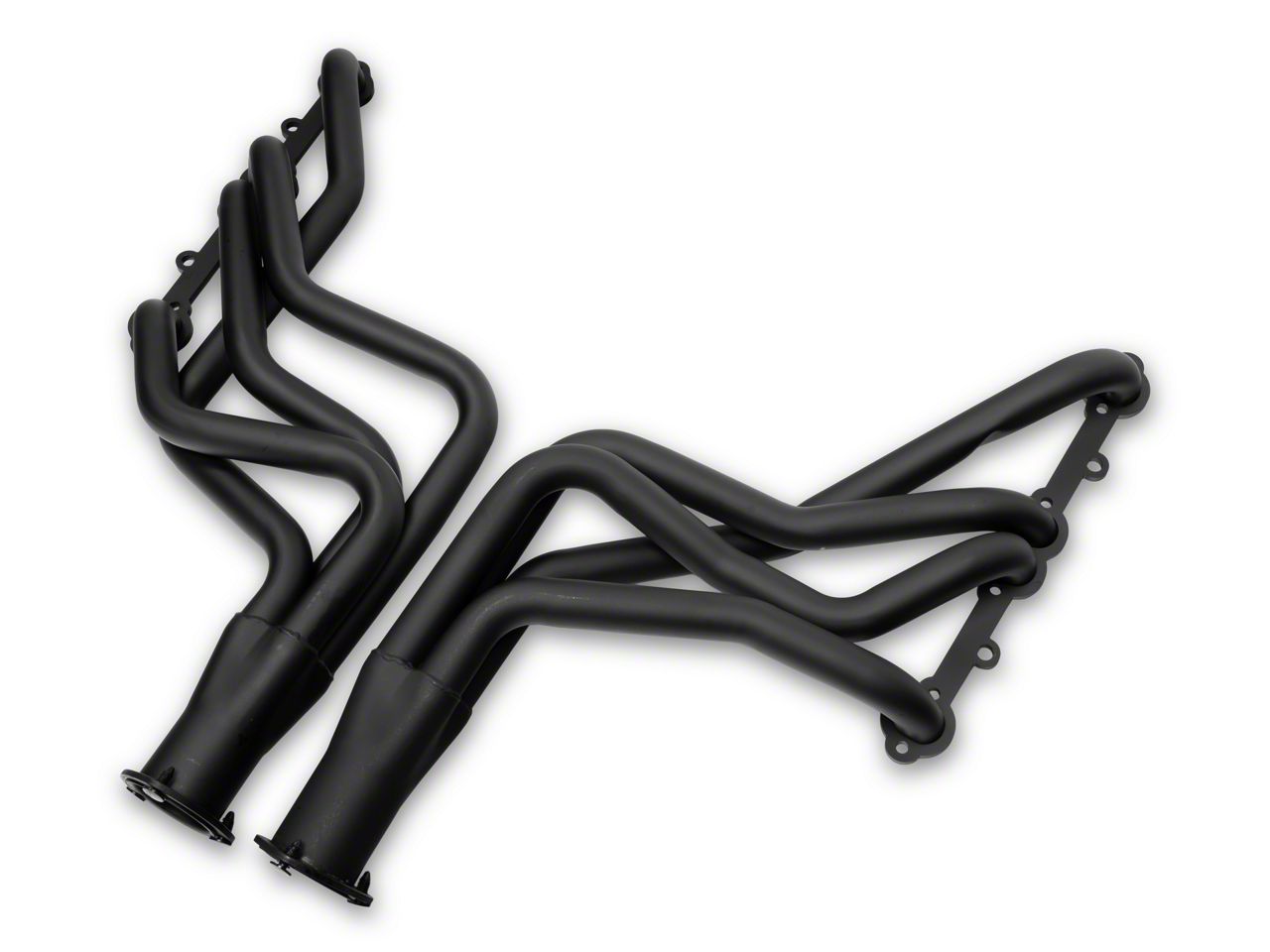Construction and Appearance. These headers feature 1-5/8-inch mandrel-bent tubing for maximum flow with minimal restrictions. The long tube design promotes scavenging and exhaust pulse velocity, improving overall engine breathing. Finished in a durable black paint, they provide corrosion resistance and an aggressive, clean look that enhances the engine bay.