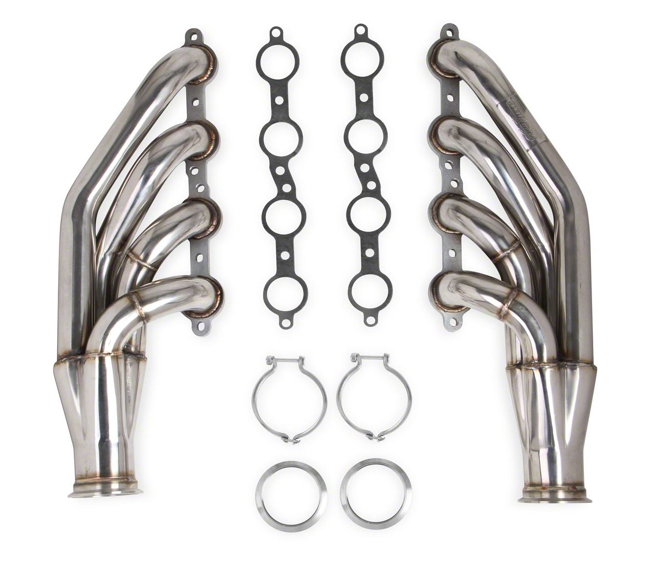 Construction and Appearance. Built from heavy-duty 16-gauge stainless steel, these headers are available in both 304 stainless (polished finish) and 409 stainless (natural, black painted, or ceramic coated) options. They feature CNC mandrel-bent tubes for smooth, consistent flow, a three-inch collector for maximum exhaust volume, and a 7/16-inch thick header flange to ensure a strong, leak-free seal. The natural finish offers a clean, raw performance look.