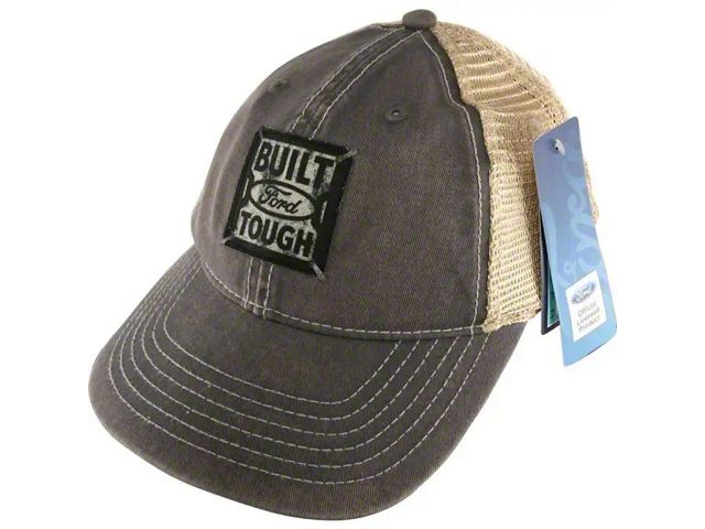 Unstructured cotton twill front panels, mesh back panels, distinctive tea-stained color, open-edge vintage label, and adjustable plastic snap closure. Storm/Tan.