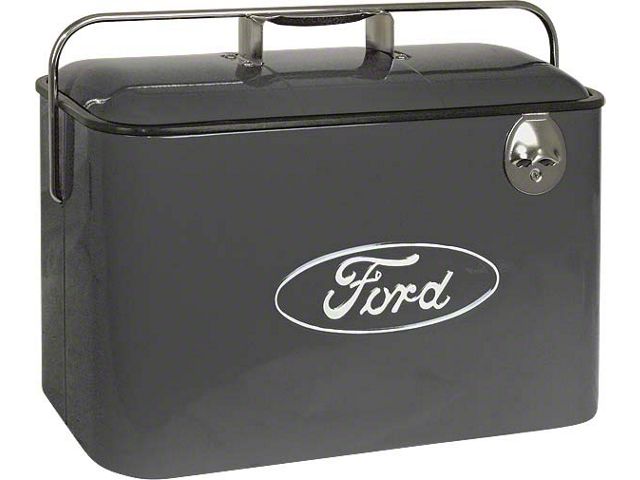 This large 5 gallon capacity, rust-resistent steel cooler has a black powder coated finish with a contrasting white Ford oval logo. It features a built-in bottle opener and a removable snack tray. The lid has a full perimeter rubber seal and the carrying handle locks onto the lid handle assuring you that it won't open 'accidentally'. So, load it up with beverages, toss in some tasty snacks and invite your buddies over for a bench racing session with a distinct Ford flavor.