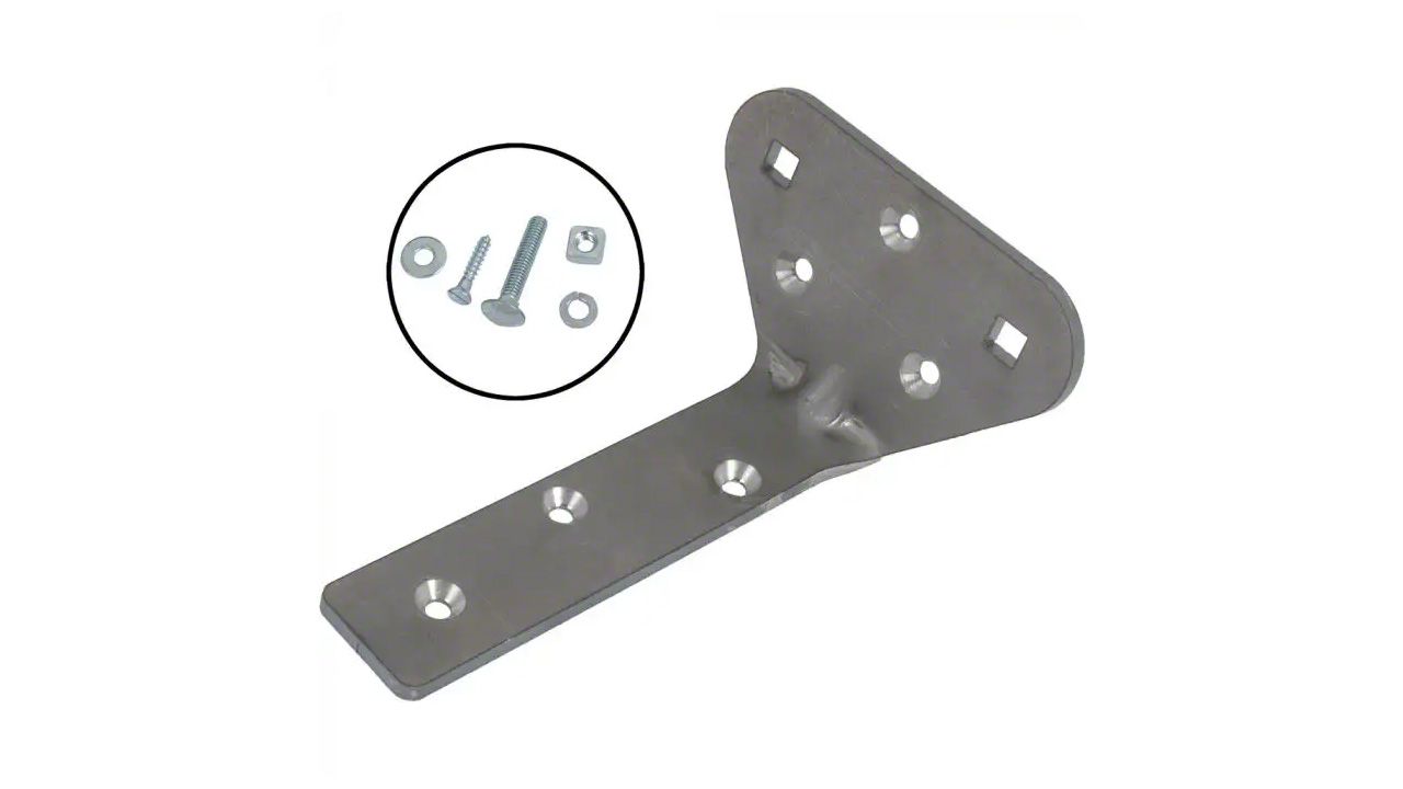 Mounts at the bottom of the center door post and helps to secure the door post to the subrail. Includes the necessary hardware.
