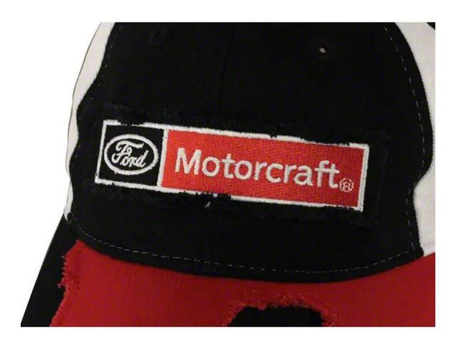 Structured cotton twill, ripped visor, and hook-and-loop tape closure. Black/White/Red. Embroidered Ford Motorcraft patch center front.