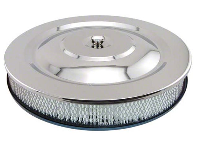 This air cleaner has a chrome top, blue base and black rubber on filter. Includes wing nut and filter which is 1 15/16" high x 13 3/4" OD x 11 1/2" ID.