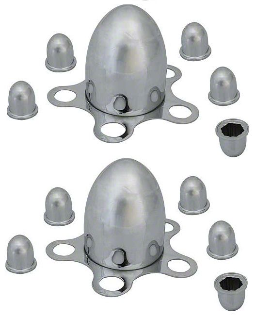 Centered by a chromed steel bullet & mounting plate, the chromed plastic lug nut covers add just the right touch. Slap on a set of trim rings for an authentic '50's look.