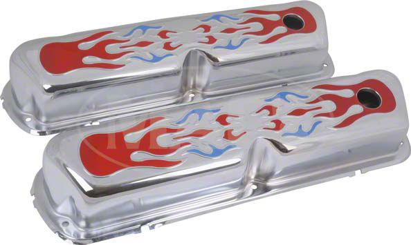 Ford Valve Covers, Small Block, Chrome, Red & Blue Flames, 1962-1979