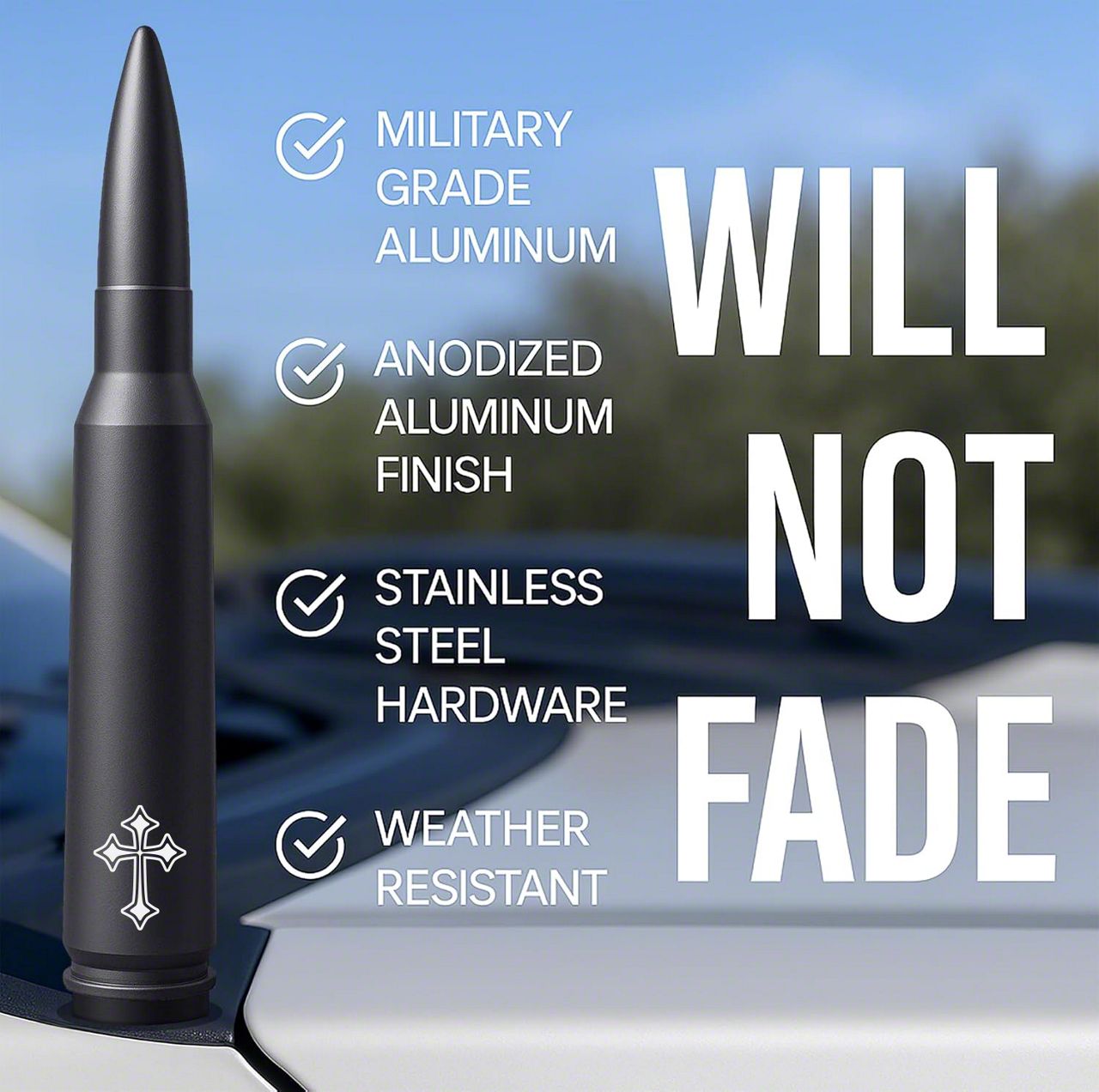 ADD ATTITUDE TO YOUR TRUCK – Ditch your long, boring factory antenna and give your truck the upgrade it deserves. The Badass Bullet Antenna is crafted to the exact dimensions of a real .50 caliber bullet, adding a bold, aggressive custom look that instantly transforms your ride’s appearance.
