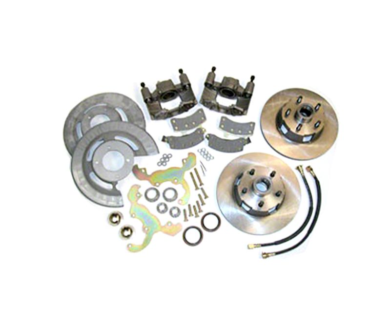 This new disc brake kit features special adapter plates that let the customer utilize their stock spindles. No need to remove the spindle (no special tools for ball joint separation or re-installation) and does not have to have the front end re-aligned, saving time and expense. Additionally, this kit uses a smaller, lower profile caliper that allows the use of most 1968 and later factory 14 inch wheels. Applications available for 4, 5 or 4 to 5 lug conversion. All disc brake kits come with detailed instructions, and will require custom lines to be run from the master to the calipers.