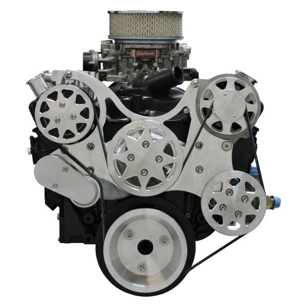Front Drive System, Small Block Chevy, w/ On Board PS Reservoir, Machine finish, w/ AC and Power Steering (59-87 El Camino; 71-77 Sprint; 78-87 Caballero)