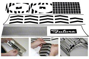 We have created a vinyl trim kit that is used to replace your factory paint accents on original aluminum grille, rear panel molding and quarter panel chevrons. This kit is precision cut black vinyl made to match yor factory paint accents. Eliminate masking and painting and get durable attractive vinyl to replace factory paint! When installed looks as good or better than factory paint and saves many hours of labor. Can be applied over existing paint or after a part has been polished or reanodized. This handy kit will save you time and money. Comes complete with instructions for proper installation.