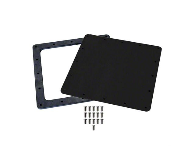 The Fuel Pump Access Door kit allows a bolt on cover to be located above the fuel pump so the fuel tank does not have to be removed to change or service the fuel pump. The inner opening clearance is 9” x 9” and includes a 1/4” thick steel weld plate with tapped holes and a 1/8” thick black anodized aluminum cover with stainless button head mounting bolts