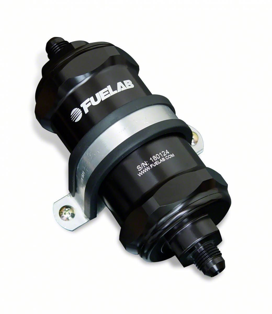 6AN inlet/outlet Fuelab filter with short (3 inch) 6 micron / Micro-Fiberglass Element