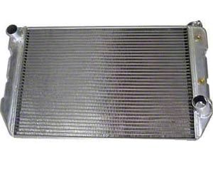 This downflow 2 row aluminum radiator fits V8 big block cars with manual transmissions. It features 1" tube size and top right bottom left hose configuration and is good for 400 horsepower with no air conditioning. The aluminum radiators are not the exact same dimensions as original radiators. Because of this our fan shroud may not fit them.