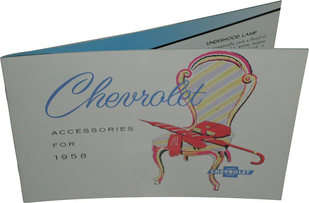Dealer accessory books offer a little pizzazz to your display at the next local car show. This copy of the original dealer accessory book was available at your local Chevy dealer in 1958. It detailed many of the accessories available for your Bel Air, Nomad, Biscayne or Impala so anyone could pick out a great gift for you. Eckler's Late Great Chevy has the best parts at the best price for your 1958 Chevy.