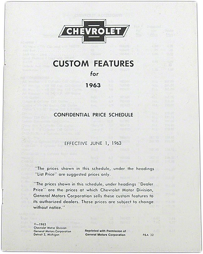 This reproduction folder includes original part numbers, dealer cost & retail information on the original Chevrolet accessories, 6 pages, 5-1/2" x 8-1/2", saddle stitched.