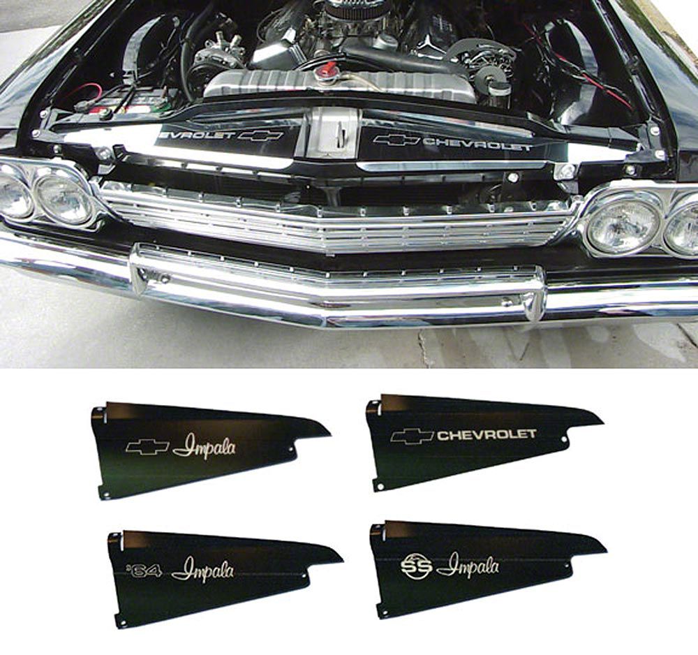 Full Size Chevy Core Support Filler Panels, Black Anodized,With Logo/Design, 1964