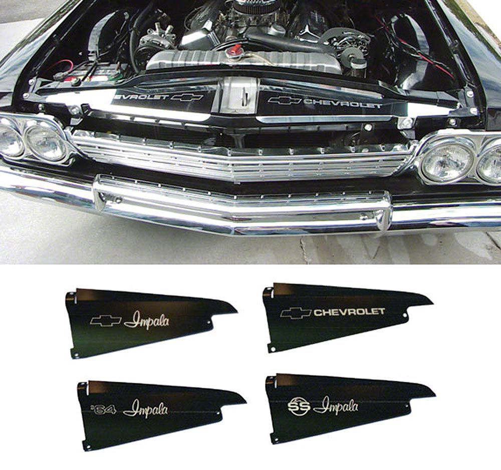 Full Size Chevy Core Support Filler Panels, Clear Anodized Silver Satin , With Logo/Design, 1964