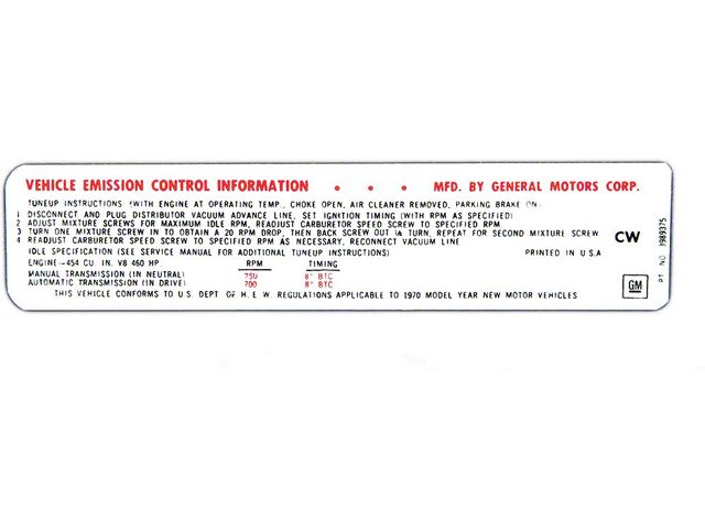 Emissions decals can add the finishing touch to your Chevy restoration. Although not required until 1971, some earlier models were equipped with smog control. We are proud to offer a superior reproduction of the factory emissions decal. Be sure to check your original, since these crisply printed decals are specially coded to your car You will find the quality and appearance will work superbly for your restoration. In addition, using a replacement emission decal from Eckler's Late Great Chevy will add authenticity and value to your Chevy.