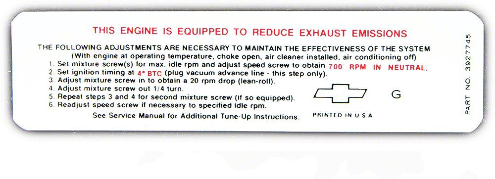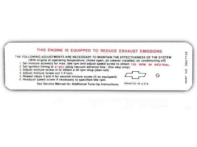 Emissions decals can add the finishing touch to your Chevy restoration. Although not required until 1971, some earlier models were equipped with smog control. We are proud to offer a superior reproduction of the factory emissions decal. Be sure to check your original, since these crisply printed decals are specially coded to your car You will find the quality and appearance will work superbly for your restoration. In addition, using a replacement emission decal from Eckler's Late Great Chevy will add authenticity and value to your Chevy.