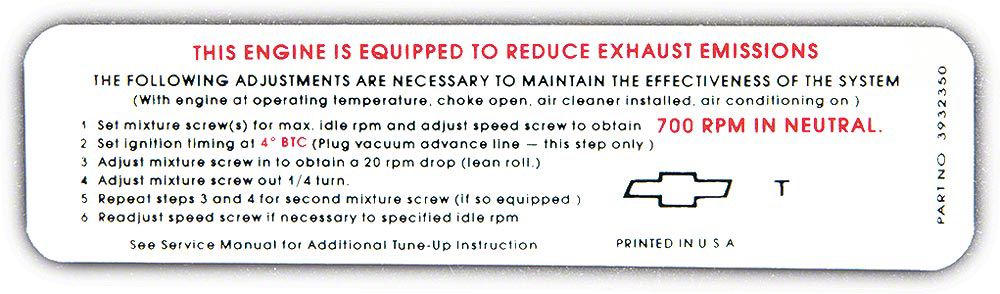 Emissions decals can add the finishing touch to your Chevy restoration. Although not required until 1971, some earlier models were equipped with smog control. We are proud to offer a superior reproduction of the factory emissions decal. Be sure to check your original, since these crisply printed decals are specially coded to your car You will find the quality and appearance will work superbly for your restoration. In addition, using a replacement emission decal from Eckler's Late Great Chevy will add authenticity and value to your Chevy.