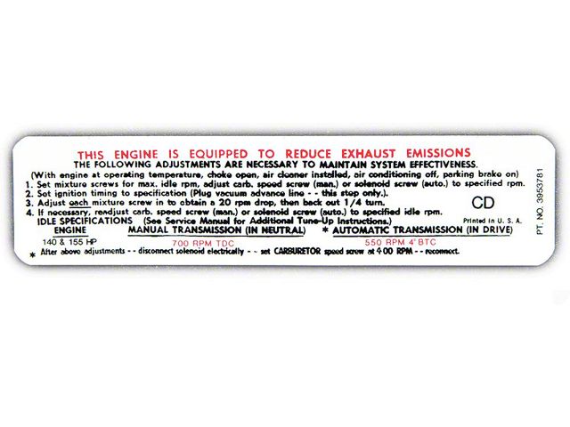 Emissions decals can add the finishing touch to your Chevy restoration. Although not required until 1971, some earlier models were equipped with smog control. We are proud to offer a superior reproduction of the factory emissions decal. Be sure to check your original, since these crisply printed decals are specially coded to your car You will find the quality and appearance will work superbly for your restoration. In addition, using a replacement emission decal from Eckler's Late Great Chevy will add authenticity and value to your Chevy.