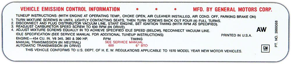 Emissions decals can add the finishing touch to your Chevy restoration. Although not required until 1971, some earlier models were equipped with smog control. We are proud to offer a superior reproduction of the factory emissions decal. Be sure to check your original, since these crisply printed decals are specially coded to your car You will find the quality and appearance will work superbly for your restoration. In addition, using a replacement emission decal from Eckler's Late Great Chevy will add authenticity and value to your Chevy.