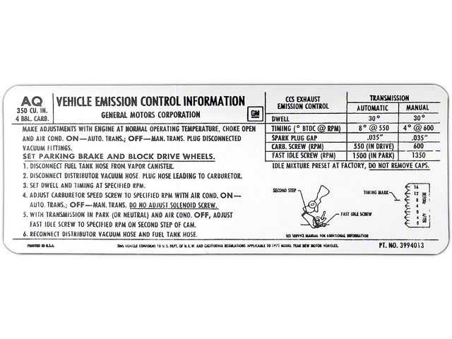 Emissions decals can add the finishing touch to your Chevy restoration. Although not required until 1971, some earlier models were equipped with smog control. We are proud to offer a superior reproduction of the factory emissions decal. Be sure to check your original, since these crisply printed decals are specially coded to your car You will find the quality and appearance will work superbly for your restoration. In addition, using a replacement emission decal from Eckler's Late Great Chevy will add authenticity and value to your Chevy.