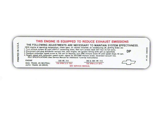 Emissions decals can add the finishing touch to your Chevy restoration. Although not required until 1971, some earlier models were equipped with smog control. We are proud to offer a superior reproduction of the factory emissions decal. Be sure to check your original, since these crisply printed decals are specially coded to your car You will find the quality and appearance will work superbly for your restoration. In addition, using a replacement emission decal from Eckler's Late Great Chevy will add authenticity and value to your Chevy.