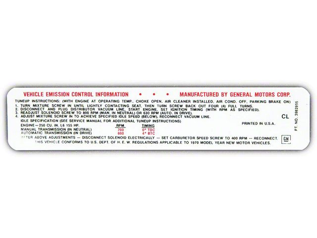 Emissions decals can add the finishing touch to your Chevy restoration. Although not required until 1971, some earlier models were equipped with smog control. We are proud to offer a superior reproduction of the factory emissions decal. Be sure to check your original, since these crisply printed decals are specially coded to your car You will find the quality and appearance will work superbly for your restoration. In addition, using a replacement emission decal from Eckler's Late Great Chevy will add authenticity and value to your Chevy.