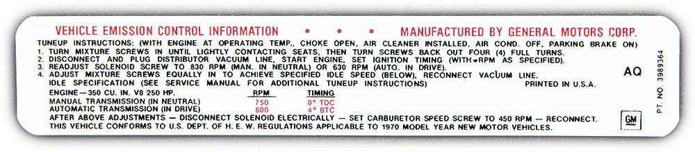 Emissions decals can add the finishing touch to your Chevy restoration. Although not required until 1971, some earlier models were equipped with smog control. We are proud to offer a superior reproduction of the factory emissions decal. Be sure to check your original, since these crisply printed decals are specially coded to your car You will find the quality and appearance will work superbly for your restoration. In addition, using a replacement emission decal from Eckler's Late Great Chevy will add authenticity and value to your Chevy.