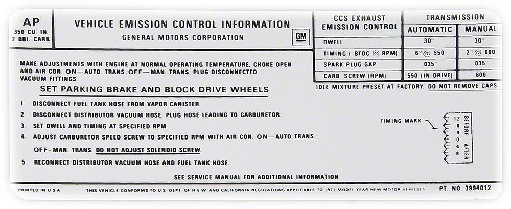 Emissions decals can add the finishing touch to your Chevy restoration. Although not required until 1971, some earlier models were equipped with smog control. We are proud to offer a superior reproduction of the factory emissions decal. Be sure to check your original, since these crisply printed decals are specially coded to your car You will find the quality and appearance will work superbly for your restoration. In addition, using a replacement emission decal from Eckler's Late Great Chevy will add authenticity and value to your Chevy.
