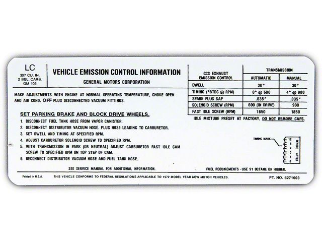 Emissions decals can add the finishing touch to your Chevy restoration. Although not required until 1971, some earlier models were equipped with smog control. We are proud to offer a superior reproduction of the factory emissions decal. Be sure to check your original, since these crisply printed decals are specially coded to your car You will find the quality and appearance will work superbly for your restoration. In addition, using a replacement emission decal from Eckler's Late Great Chevy will add authenticity and value to your Chevy.