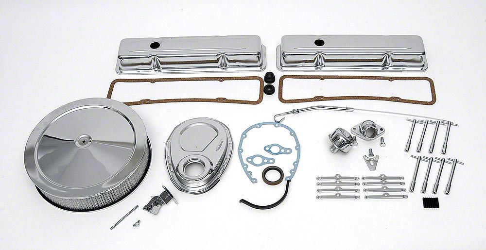 - Includes Chrome Valve Covers, Breather, Hold-Down Clamps, Thermostat Housing, Distributor Hold-Down, 14" Air Cleaner With Element, Timing Cover & Tab, Dipstick With Tube & All Related Gaskets.