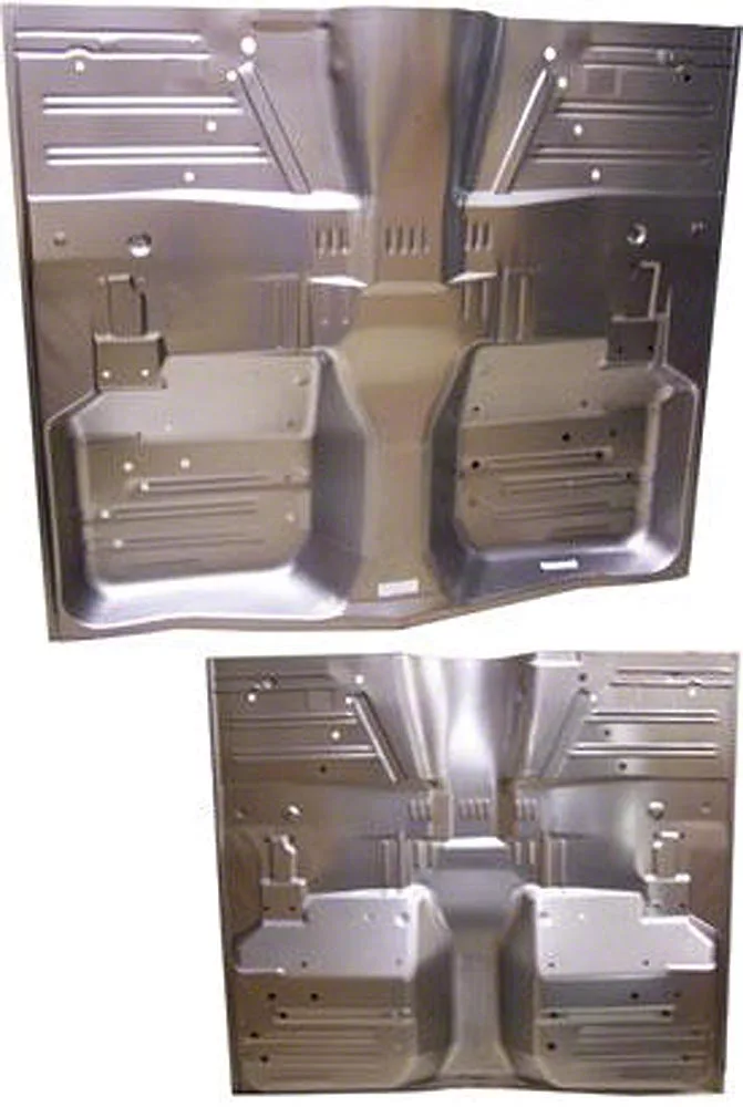 Eckler’s Late Great Chevy stamped steel sheet metal floor pan repair panels are crucial when rust rears its ugly head. 1959 or 1960 Late Great Chevy floor pans take a beating over the years and are rarely rust-free. Eckler’s Late Great Chevy sources sheet metal floor pans from the world’s premium manufacturers to bring you only the very best for your restoration. Floor pans are stamped on heavy ton equipment from correct gauge steel to ensure factory style contours and maximum rigidity over originals. This complete floor pan reaches from rocker
