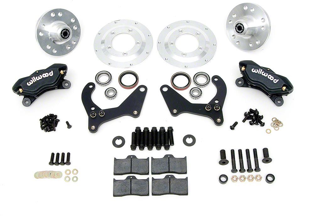 Are you ready for a huge improvement over original, unpredictable four-wheel drum brakes? If you are, then our Wilwood disc brake kit at the wheel is for you. Our kit at the wheel includes: large 2-piece 11-3/4" vented rotors, 4-piston aluminum calipers, caliper brackets, pads, bearings and all hardware needed to install. This kit moves the front wheels outboard 3/4" on each side so keep this in mind for wheel and tire clearance. The unique 2-piece caliper brackets bolt right to your stock spindles with supplied hardware. The super huge 2-piece rotors provide superior braking power as well as a great performance look when used with aftermarket wheels equipped with large slot openings. The Wilwood logo 4-piston calipers are highly visible black powder coat so all lookers will know you have