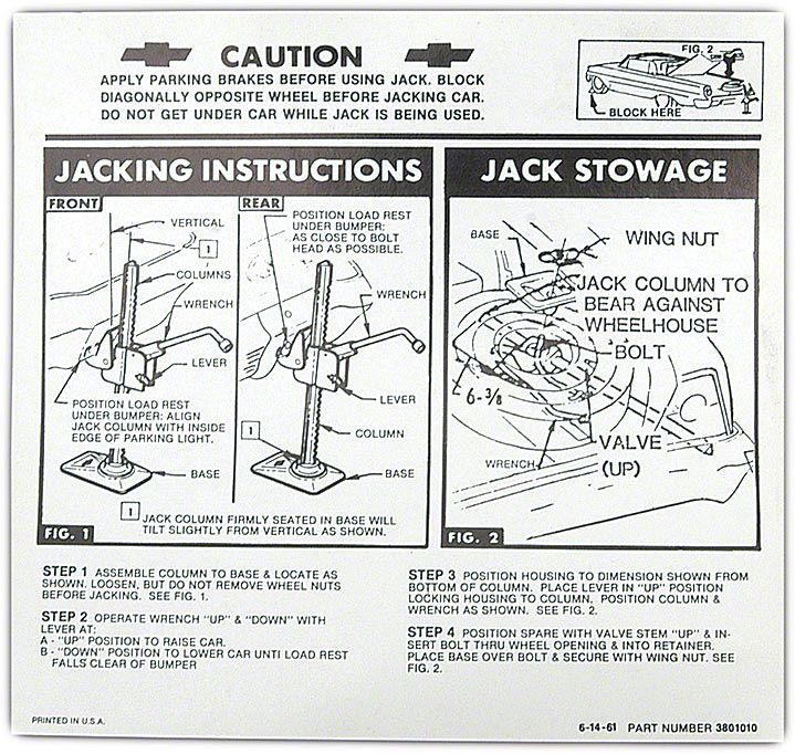 This Chevrolet reproduction jack stowage & jacking instructions sheet has been manufactured to original factory specifications using today's modern manufacturing techniques. You will find the quality and appearance will work superbly for your restoration. In addition, using a reproduction jack stowage & jacking instructions sheet from Eckler's will add authenticity and value to your Chevy.